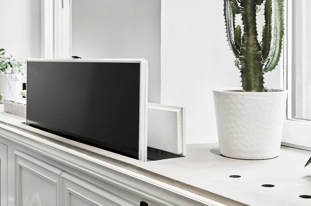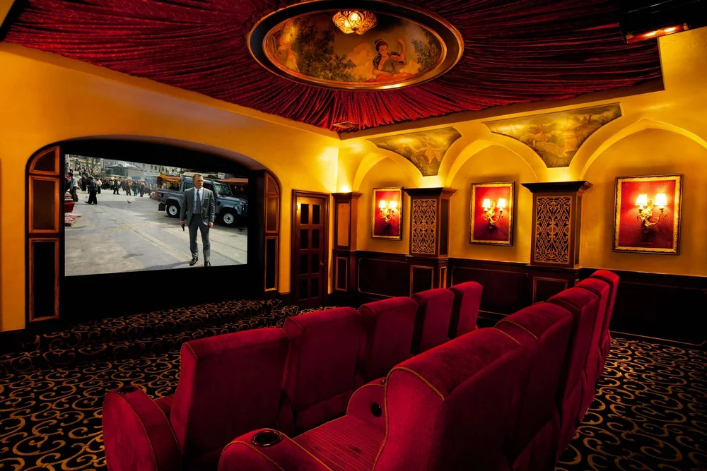 This theater was designed to fully disappear when not in use. At the touch of a button, the projection screen lowers, drapes close, and the room transforms into a dedicated cinema. When powered off, the screen retracts, drapes open, and the space returns to its original architectural intent. The projector is concealed in custom millwork with only a discrete lens port visible, maintaining a clean, unobtrusive look at all times.