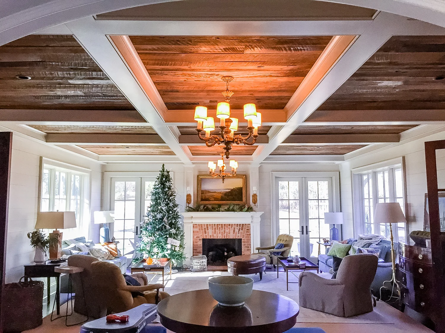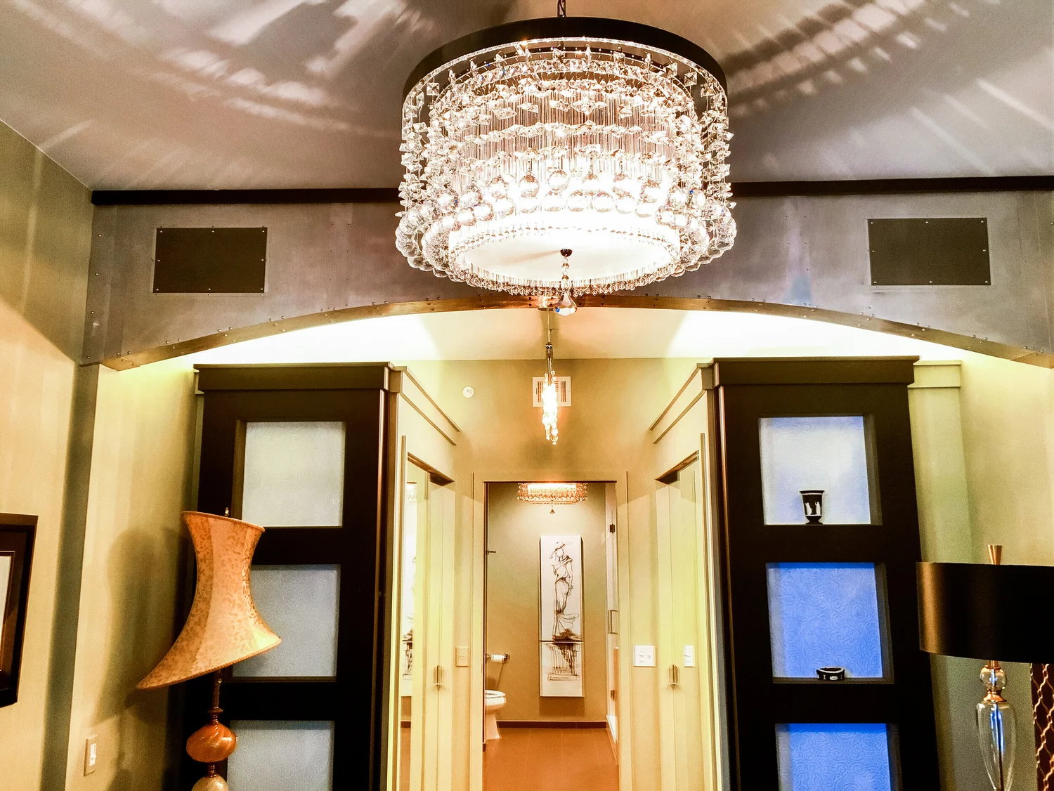 We installed hidden speakers in this fine wood ceiling. The speakers nestled behind the wood with small slits for the sound. Huge room sound, without seeing the speakers.